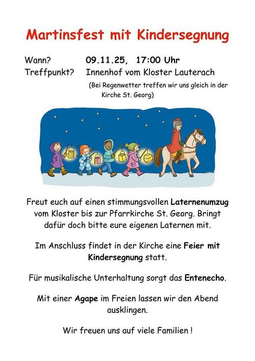 09.11.2025, 17:00 Uhr Laternenumzug mit Kindersegnung (Treffpunkt Kloster Lauterach) Klosterkirche St. Josefskloster der Redemptoristinnen Bundesstraße 38 6923 Lauterach Mehr lesen