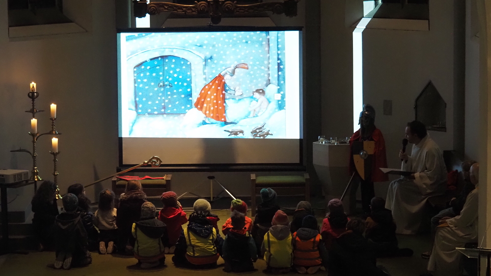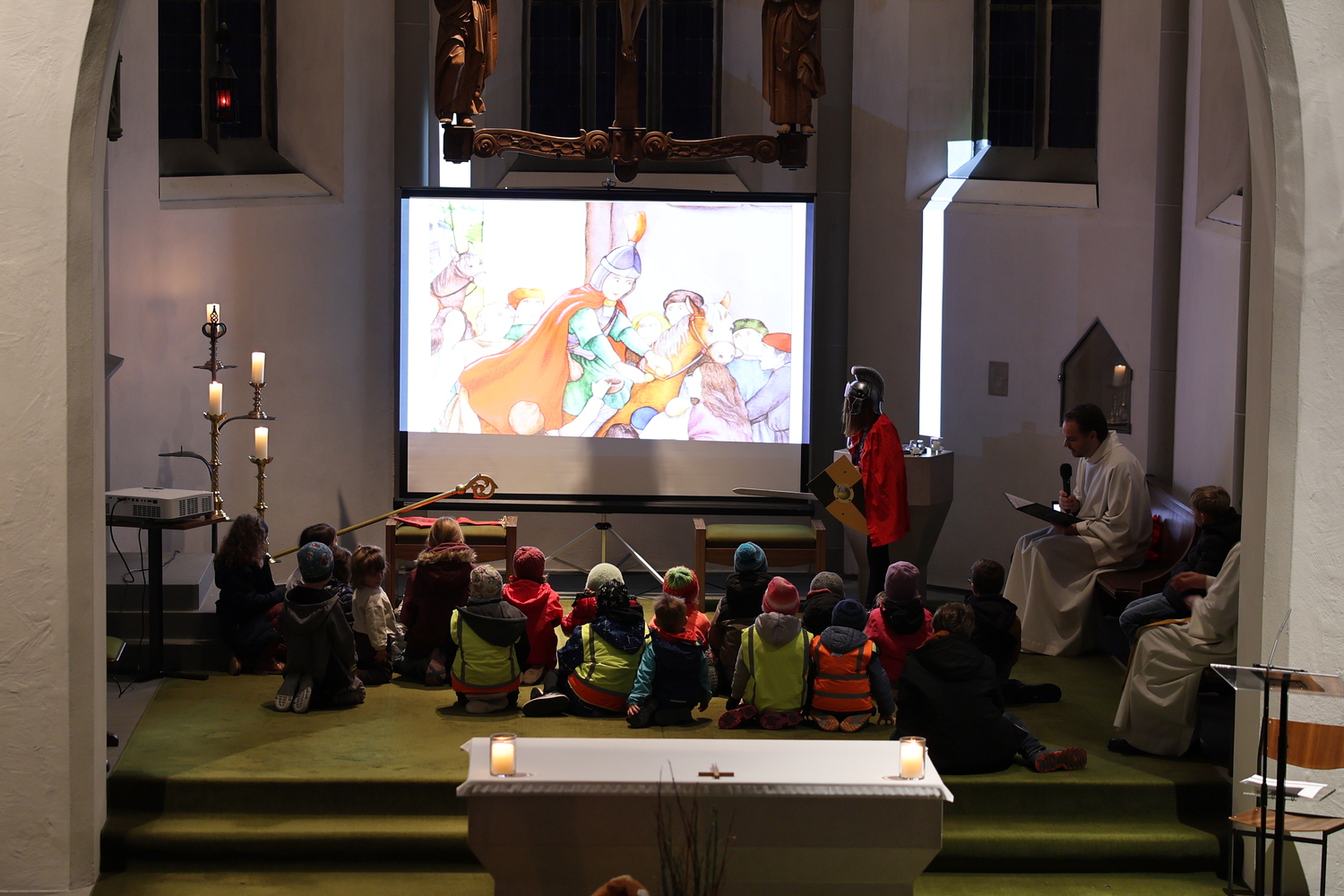 Nach dem Evangelium durften die Kinder im Altarraum Platz nehmen, wo ihnen Michael Willam die Geschichte vom Heiligen Martin erzählte: